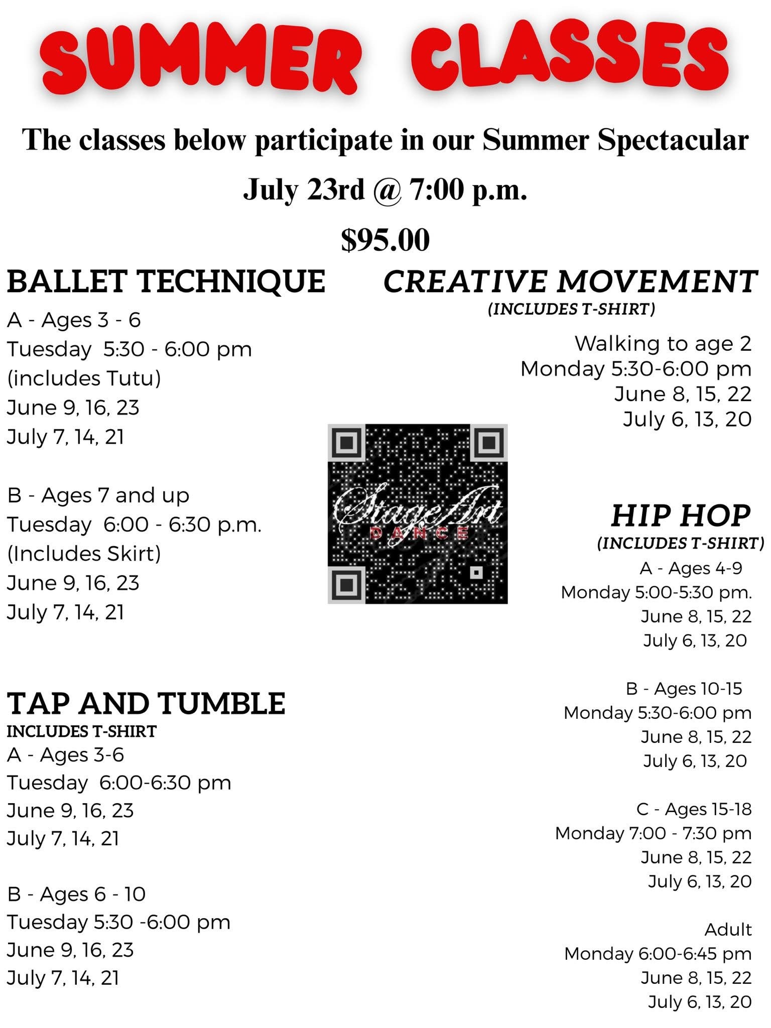 Offering Tap, Jazz, Ballet, Pointe, Contemporary, Hip Hop, Pointe, Musical Theatre, Tumbling, Pom, Cheerleading, Fitness, Preschool, Dancely and Company classes.